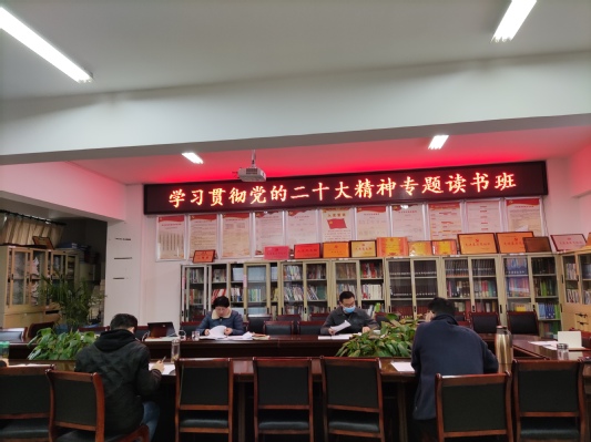 1月12日下午,我院党委在学院资料室举办学习贯彻党的二十大精神专题读书班,院党委书记夏光兰主持会议,学院党委理论学习中心组成员参加学习。
