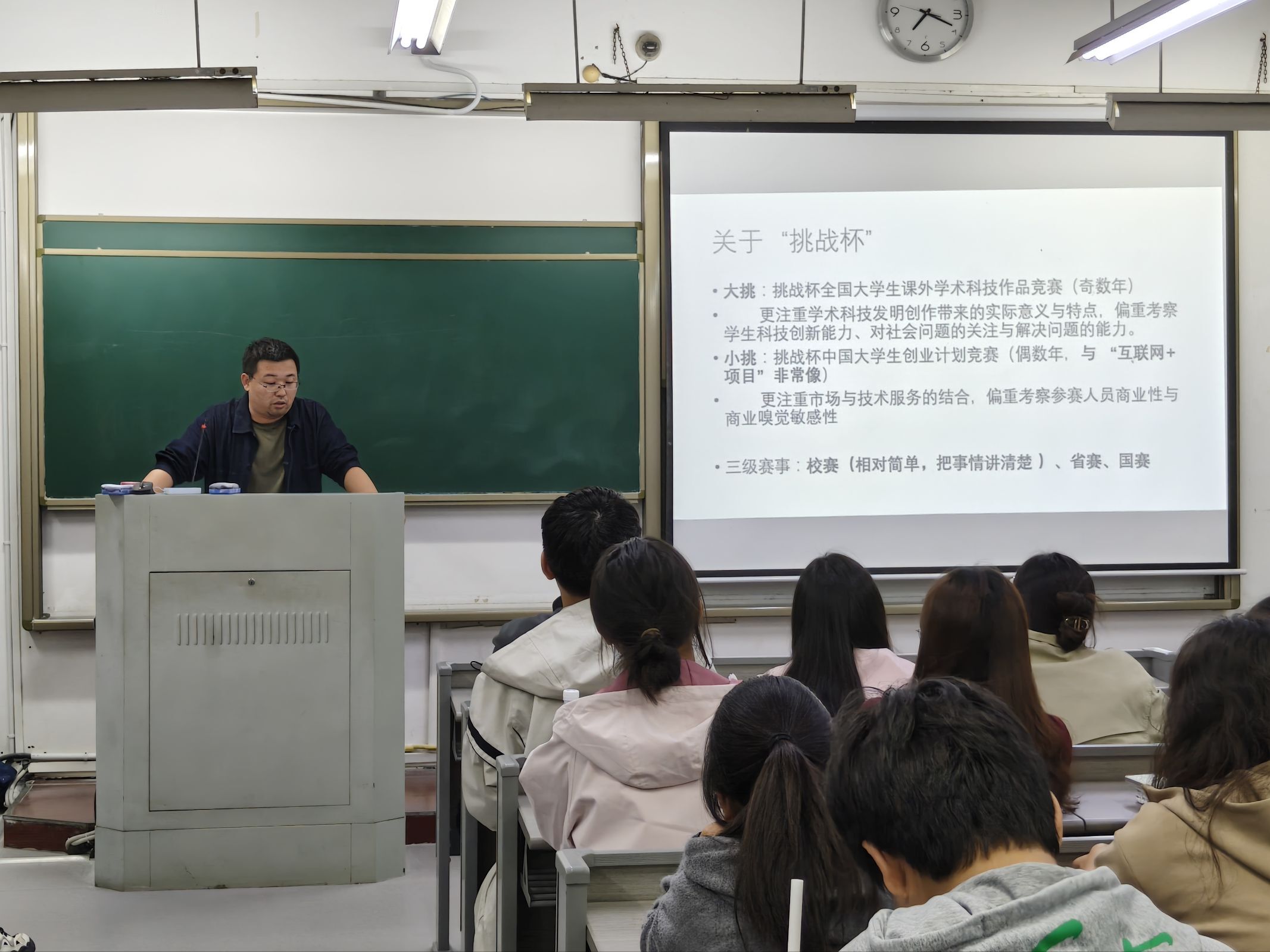 王电双老师围绕“挑战杯”竞赛的赛制特点、评审标准和备赛要点进行了系统讲解,从项目选题、团队构建、计划书撰写、现场展示等方面展开培训。孙阳、胡甜甜、杜佳颐结合参赛经历,从项目孵化、时间管理、难点突破、答辩技巧等角度作分享交流。答疑环节,同学们围绕团队组建、项目立意、学科交叉等问题踊跃提问,老师和同学们给予了细致解答。